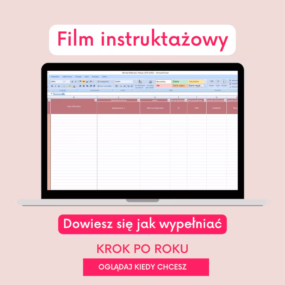 Nie jesteś ‘Mistrzem Excela’? Bez obaw – otrzymasz od nas BONUS. Film, który krok po kroku pokaże Ci, jak skutecznie uzupełnić plik. W paczce otrzymasz link do prywatnego filmu, dzięki niemu zobaczysz jak skutecznie uzupełniać pola, tak abyś mogła spać spokojnie i mieć wszystko dobrze rozplanowane.