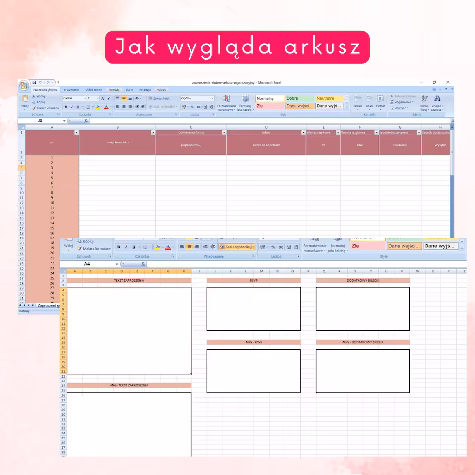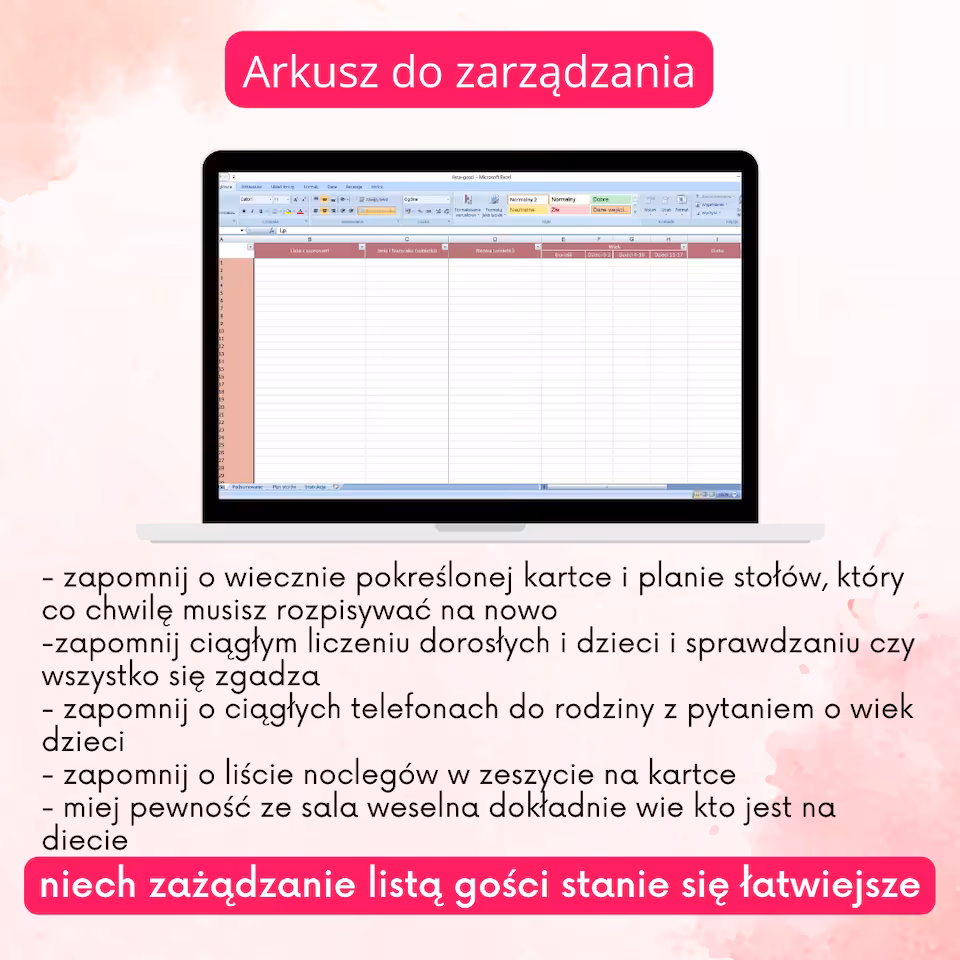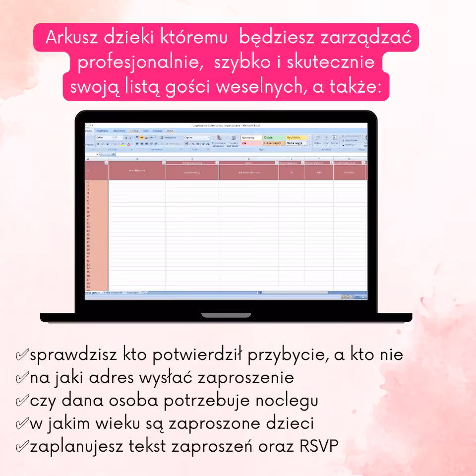 Miej rękę na pulsie i skorzystaj z 1 pliku (dopasowany pod format Microsoft Excel oraz Open Office), który pozwoli Ci zarządzać całą listą gości oraz zaproszeniami ślubnymi. Jest to arkusz kalkulacyjny, wyglądający jak duża tabela, w której zbierzesz wszystkie potrzebne informacje o Twoich gościach. W przeciwieństwie do własnych zapisków gdzie każda zmiana zdania na temat np. obecności na weselu czy korzystania z noclegu wywraca wszystkie wyliczenia do góry nogami nie wspominając nawet o planie stołów w tym pliku każda zmiana pociąga za sobą kolejne ale w sposób automatyczny. Nie ma więc mowy o jakiejkolwiek pomyłce.